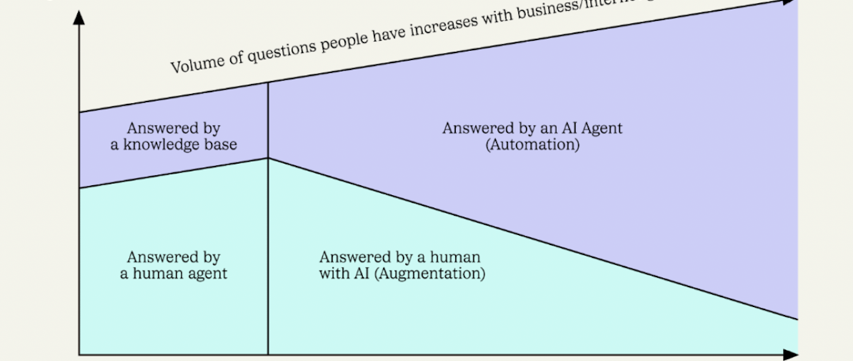 AI Augmentatie: Met de komst van AI begonnen menselijke agenten gebruik te maken van AI-tools om hun mogelijkheden uit te breiden. AI kon helpen om snel informatie te vinden of reacties voor te stellen, waardoor de efficiëntie en reactietijden toenamen.